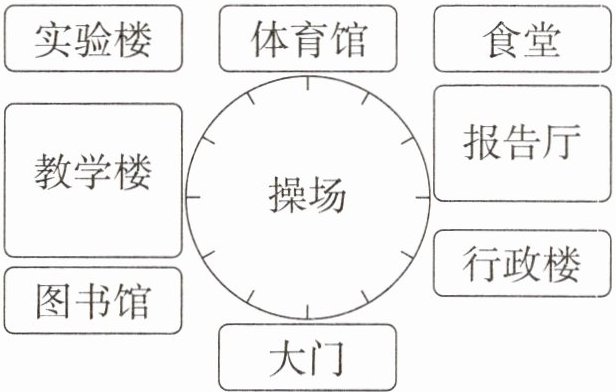 (2)报告厅的6点钟方向是( ),教学楼的12点钟方向是( )。