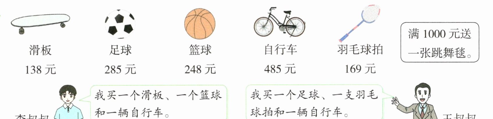 (1)880 950 (答案不唯一);(2)李叔叔:138+248+485=871(元)王叔叔:285+169+485=939(元);(3)285+248+485=1018(元)1018>1000 买足球、篮球和自行车三种商品能获得跳舞毯。