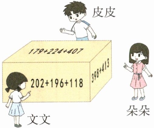 解析:皮皮的观察位置是从上往下观察,所以他看到了算式179+224+407,朵朵是从右边观察,所以她看到了算式398+413,文文是从前面观察,所以她看到了算式202+196+118。