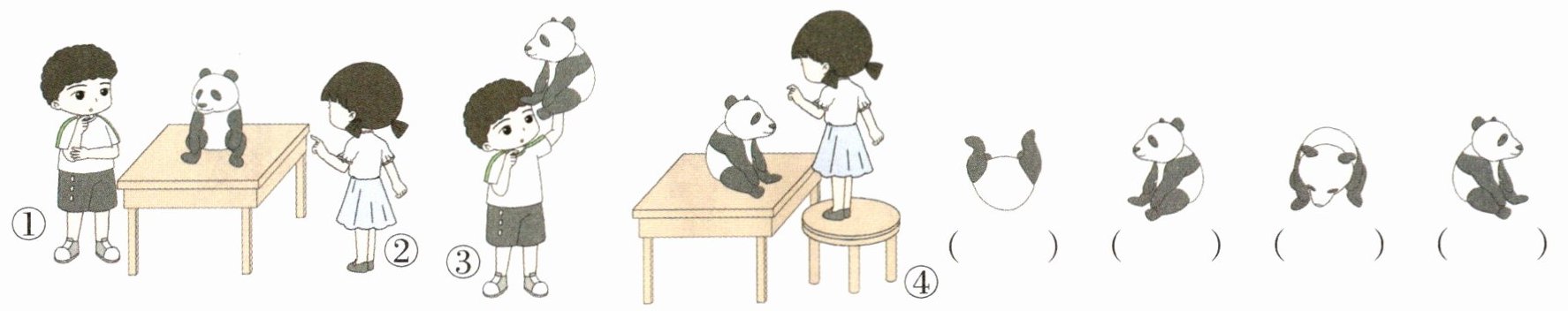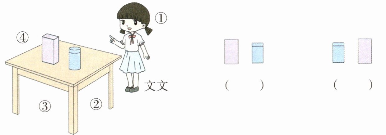 2. 下面右边两幅图分别是文文从哪个位置看到的?把序号填在括号里。