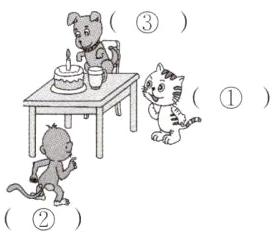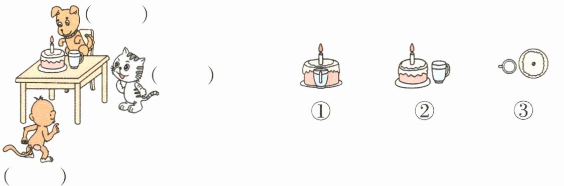 1. 小动物们过生日,下面右边的图片分别是在哪个位置看到的?填上对应的序号。