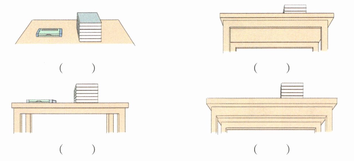 解析:龙一鸣和文文是站着画图,所以能看到图形的全貌。从龙一鸣观察的位置看,苹果在花瓶的右边,所以是第3幅图,而文文与龙一鸣的观察位置刚好相反,所以是第2幅图,奇奇坐在小板凳上平视,所以看到的是第4幅图,朵朵是坐在地上观察的,看到的画面是仰视的画面,是第1幅图。