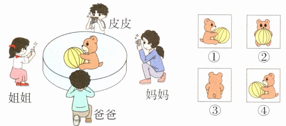 4. 填一填。图片①是( )拍摄的;图片( )是姐姐拍摄的;图片( )是爸爸拍摄的;图片③是( )拍摄的。