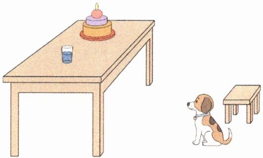 6. 桌子摆了两个物品,小狗好奇想看个究竟。①小狗趴在地上看;②小狗站在地上看;③小狗跳到凳子上看;④小狗跳到桌子上看。请你按小狗四次观察的顺序,在四个画面下的括号里标出①②③④。( ) ( ) ( ) ( )