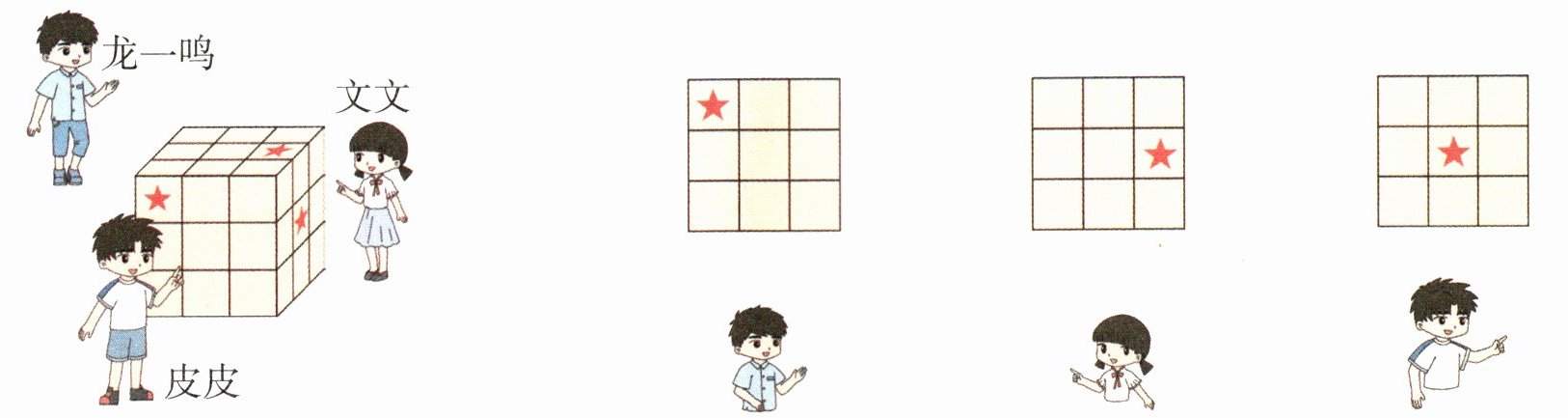 7. 龙一鸣、文文、皮皮分别看到的图形是大正方体的哪个面?连一连。