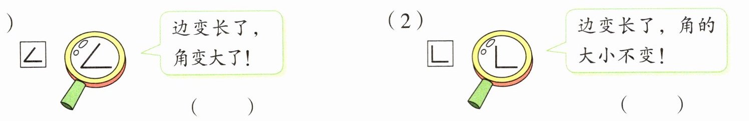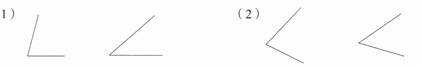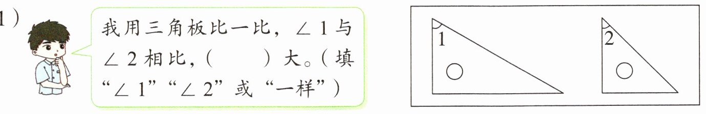 (1) 我用三角板比一比,∠1与∠2相比,( )大。(填“∠1”“∠2”或“一样”)