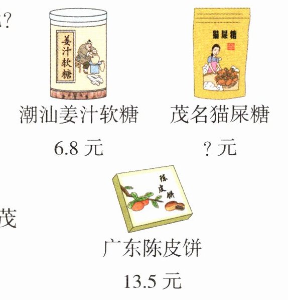 (2)根据题中的信息,一袋茂名猫屎糖比一盒广东陈皮饼便宜3.9元,所以一袋茂名猫屎糖是13.5-3.9=9.6(元)。要求买一袋茂名猫屎糖和一盒潮汕姜汁软糖共需多少元,就是把9.6元和6.8元合起来,用加法计算。