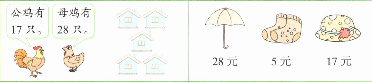 | 公鸡有17只。母鸡有28只。 | 28元 5元 17元 |