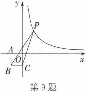 9. (2023·株洲)如图,在平面直角坐标系中,四边形OABC为正方形,其中点A,C分别在x轴的负半轴和y轴的负半轴上,点B在第三象限内,点A的坐标为(t,0),点P(1,2)在函数y= k/x(k>0,x>0)的图象上.