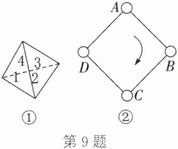 9. (新情境·游戏活动)如图①所示为一枚质地均匀的正四面体骰子,它的四个面上分别标有数字1,2,3,4.如图②,正方形ABCD的顶点处各有一个圈.跳圈游戏的规则如下:每掷一次骰子,骰子向下一面上的数字是几,就沿正方形的边按顺时针方向连续跳几个边长.从圈A起跳,若第一次掷得3,就按顺时针方向连续跳3个边长,跳到圈D;若第二次掷得2,就从圈D开始按顺时针方向连续跳2个边长,跳到圈B……