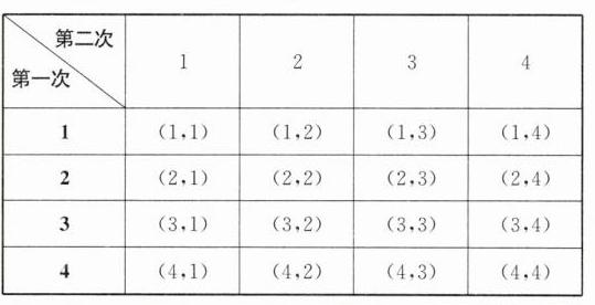 由表可知,共有16种等可能的结果,淇淇最后跳回到圈A的结果有(1,3),(2,2),(3,1),(4,4),共4种,