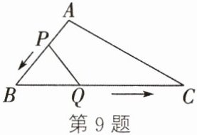 9. (分类讨论思想)(2024·绍兴上虞期中)如图,在△ABC 中,AB= 10 cm,BC= 20 cm,点 P 从点 A 出发,沿 AB 以 2 cm/s 的速度运动到点 B 停止,同时点 Q 从点 B 出发,沿 BC 以 4 cm/s 的速度运动到点 C 停止,则经过