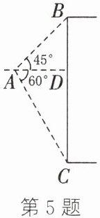 5. (2024·杭州余杭期中)“科技改变生活”,小王是一名摄影爱好者,新入手一台无人机用于航拍.如图,在一次航拍时,数据显示,从无人机A看建筑物顶部B的仰角为45°,看底部C的俯角为60°,无人机A到该建筑物BC的水平距离AD为10米,求该建筑物BC的高度(结果精确到0.1米,参考数据:$\sqrt{2}\approx1.41$,$\sqrt{3}\approx1.73$).