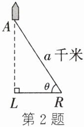 2. (2024·长春)2024年5月29日16时12分,“长春净月一号”卫星搭乘谷神星一号火箭在黄海海域成功发射.如图,当火箭上升到点A处时,位于海平面R处的雷达测得点R到点A的距离为a千米,仰角为$\theta$,则此时火箭距海平面的高度AL为 (