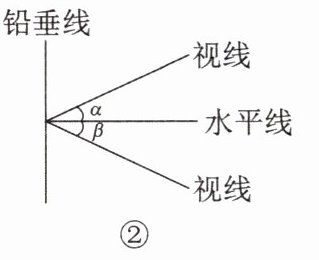 2. 仰角、俯角:如图②,在进行测量时,从下往上看,视线与水平线的夹角($\angle \alpha$)叫做