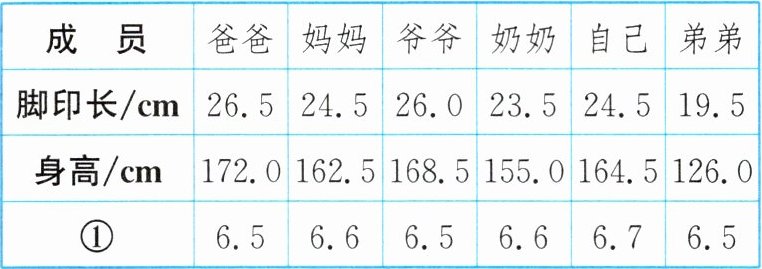 警察常常利用罪犯遗留下来的脚印,来测算罪犯所穿鞋的尺码,从而推算出罪犯的身高。人的脚印长度与身高有什么关系?小杭大胆猜测:人的脚印长度和身高存在一定的倍数关系。为了验证自己的猜想,小杭测量了家中部分成员的脚印长和身高,并记录如下: