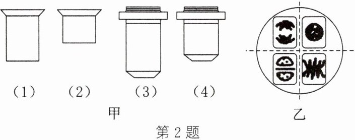 2. 如图甲是显微镜镜头,目镜标有“5×”和“16×”字样,物镜标有“10×”和“40×”字样,图乙是某同学在图甲中选用的一组能放大160倍的镜头组合所观察到的图像。欲将图乙视野中左上方的细胞移至视野中央进行640倍的放大观察,正确的镜头组合及操作应是 (