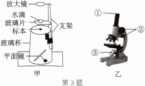 3. 小金利用水滴、放大镜、平面镜、透明玻璃杯和可调支架等制作了一台“水滴显微镜”(图甲)。通过调节支架高度,适当调整标本、水滴和放大镜三者之间的距离,可实现与图乙所示的光学显微镜相似的成像效果。下列说法错误的是 (