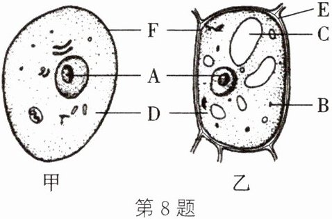 8. 因冰层消融,科学家预计80年内南极洲半数帝企鹅或消失。为更进一步了解和保护它们,人们用显微镜观察帝企鹅体细胞和南洋杉细胞结构,并绘出甲、乙两图,据图填空。