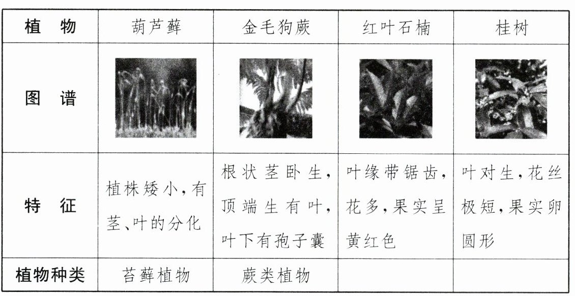 |特征|植株矮小,有茎、叶的分化|根状茎卧生,顶端生有叶,叶下有孢子囊|叶缘带锯齿,花多,果实呈黄红色|叶对生,花丝极短,果实卵圆形|