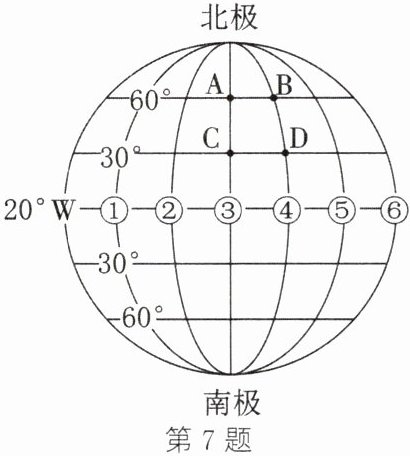 7. 读投影到白墙壁上的经纬网地球仪图,回答下列问题: