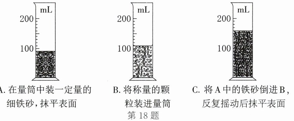 18. 某科学兴趣小组同学测量一种易溶于水且形状不规则固体小颗粒物质的体积,测量的方法和结果如图所示。