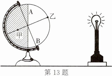 13. 某班学生在学习“地球的自转”时,运用地球仪做了一个演示实验:在暗室里,将一盏电灯放在桌子上代表太阳,在电灯旁放置一个地球仪代表地球,拨动地球仪模拟地球自转运动,观察地球仪上的受光区域及其变化。根据演示实验方法及示意图回答问题。