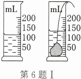 6. 用量筒测量小石块的体积。甲同学的做法是在量筒里注入适量的水,记下水的体积为$V_1$,然后轻轻放入小石块,使量筒里的水浸没石块,记下此时水及石块的体积为$V_2$,计算石块的体积为$V_2 - V_1$。
