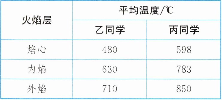 (2)实验二:定量研究。乙同学和丙同学在老师指导下,分别利用高温传感器测得酒精灯各层火焰平均温度如表所示,根据表格数据得出结论: