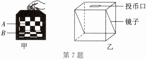 7. (易错易混)如图甲所示,魔术师将空箱的正面朝向观众,将一枚硬币投入箱子后,发现硬币凭空消失了。实质上,魔术箱的内部构造如图乙所示,正面是透明的,底部贴有黑白相间的方格纸,镜子与底面成45°角放置,且反射面朝前。则图甲中A、B两个黑方块的大小关系为A