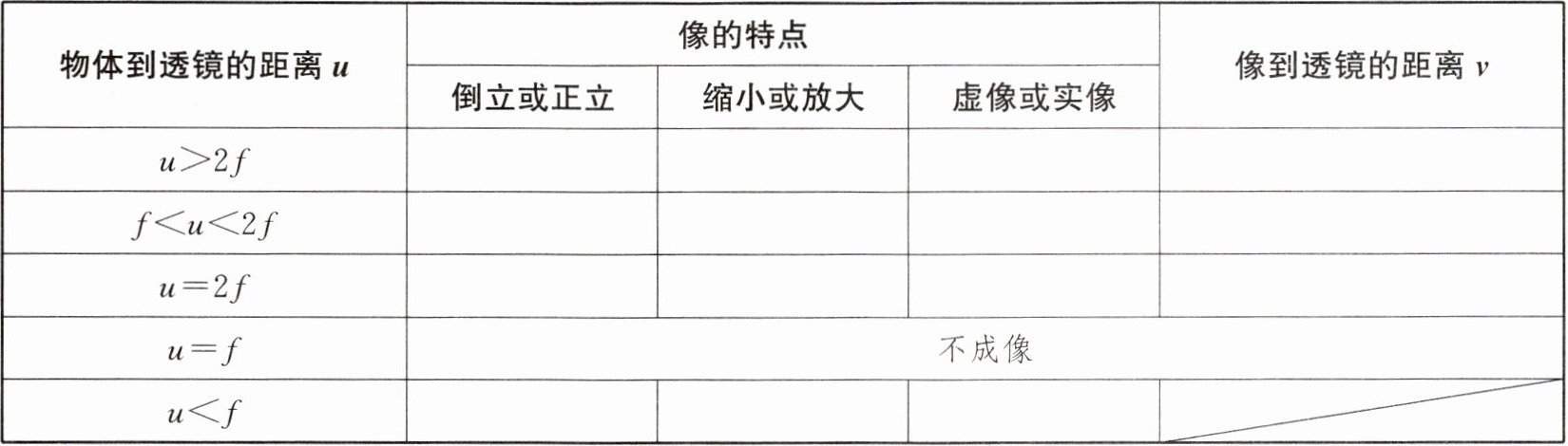 |物体到透镜的距离u|像的特点|||像到透镜的距离v|