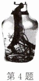 4. (生活实践)如图所示,把人参泡在酒中,通过酒瓶看见的是人参的放大虚像,这时的瓶和酒相当于一个(
