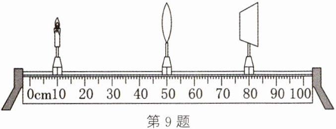 9. 实验室利用光具座研究凸透镜成像的规律。当三个元件移动到图示位置时,光屏上出现了清晰的像。回答下列问题: