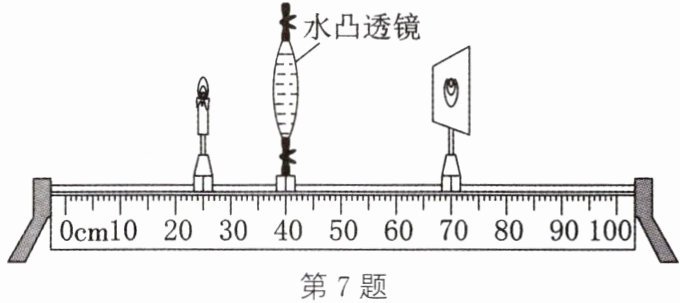 7. (实验创新)某同学用自制焦距为10 cm 的“水凸透镜”探究凸透镜成像规律,当蜡烛、“水凸透镜”和光屏位于如图所示的位置时,光屏上呈现烛焰清晰的像。现将蜡烛向左移动到15 cm 刻度线处,光屏上原来清晰的像变模糊了,保持“水凸透镜”位置不变,为了使光屏上再次呈现蜡烛清晰的像,下列说法正确的是(
