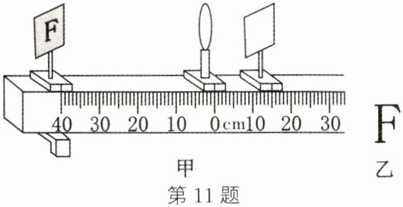 11. 在探究凸透镜成像规律时,小芳用红色的发光二极管按“F”字样镶嵌在白色不透明方格板上代替烛焰作为光源,实验使用的凸透镜焦距为10 cm,实验装置如图甲所示。