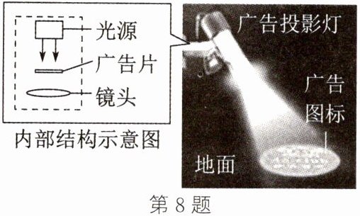 8. (易错易混)(2024·金华东阳期末)如图所示为商场门口的广告投影灯及其内部结构,它主要由光源、广告片和焦距为f的凸透镜组成,下列说法正确的是 (