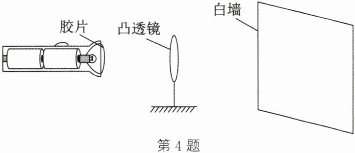 4. (生活实践)(2024·宁波宁海期末)如图所示,小科自制了一个简易投影仪,在暗室将印有图案的透明胶片贴在发白光的手电筒上,并正对一个焦距为10 cm的凸透镜,调整手电筒、凸透镜和白墙之间的位置,在墙上得到了一个清晰放大的像。下列说法正确的是 (