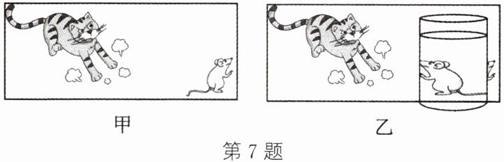7. (创新考法)(2024·宁波海曙期中)如图甲是一幅立在桌面上的漫画,如图乙,透过水杯,漫画中的老鼠变“胖”了,还掉头奔向猫,此现象的成因与______(填“照相机”“投影仪”或“放大镜”)工作原理相同。要想老鼠变“更胖”一点,应适当将水杯______(填“远离”或“靠近”)漫画。