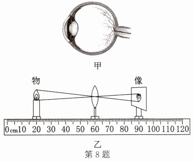 8.科学家对人的眼球进行解剖后,绘出眼球的构造图(图甲);根据眼球的结构特点,进行了模拟成像实验(图乙)。请根据图示分析并回答下列问题。