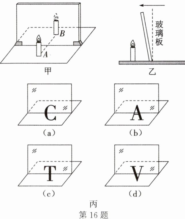 (填“向上移动”“向下移动”或“不移动")。(4)如图丙所示,小莹把“C”“A”“T”“V"四种形状的光源分别面对玻璃板竖直立在桌面上,用于研究像与物左右位置关系,最好选用图