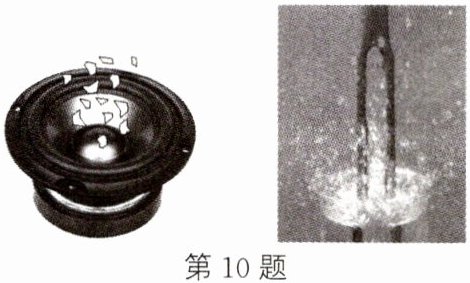 10. 如图所示,小纸片会在播音中的扬声器的纸盆上跳动,发声的音叉放在水中会激起水花。这些现象说明了(