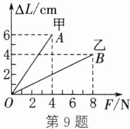 9. 科技活动小组的同学们准备自己动手制作弹簧测力计,他们选了甲、乙两种规格不同的弹簧进行测试,测试结果如图所示。图中OA段和OB段在弹性形变范围内。若要制作量程较大的弹簧测力计,则他们应选择弹簧
