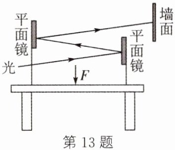 13. 如图所示,用力F按压平面镜之间的桌面时,经两平面镜反射后,照到墙面上的光点位置将
