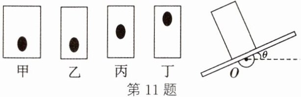 如图所示,他首先制作了甲、乙、丙、丁四块质量相同、除甲底面积较大外其他外形完全相同、重心(用黑点表示)高低不同的圆柱体,然后将它们依次放在木板上(圆柱体不滑动),慢慢转动木板,直至圆柱体翻倒,记录此时木板转过的角度。记录结果如表所示。