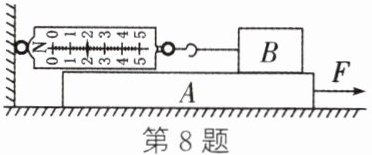 8. 如图所示,用6N的水平拉力F拉动物体A在水平地面上向右匀速运动,物体B静止不动,弹簧测力计的示数为2N,下列说法中,正确的是(