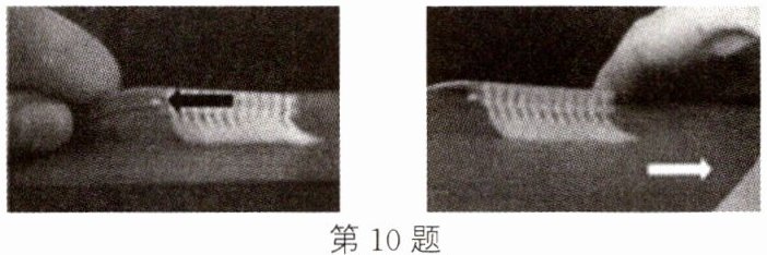 10. 学习摩擦力时,老师做了如图所示的实验:将牙刷放在木板上,向左拉动牙刷,观察到刷毛向右弯曲;保持牙刷不动,向右拉动木板,观察到刷毛还是向右弯曲。