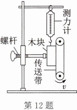 12. 某实验小组用如图所示的装置探究影响滑动摩擦力大小的因素,木块挂在测力计下,右侧面与竖直传送带接触,左侧面有可旋转的螺杆对其施加不同的压力,启动电机,传送带逆时针转动,通过测力计的读数即可计算出木块所受的摩擦力。部分实验数据如表所示。