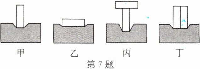 7. 在探究"压力的作用效果与哪些因素有关"的实验中,小刚利用了两个相同的木块和一块海绵,进行了如图所示的实验。