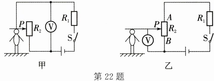 ① 根据图乙电路,当滑片P位于$R_2$的最下端B点时,电压表的示数为______V。