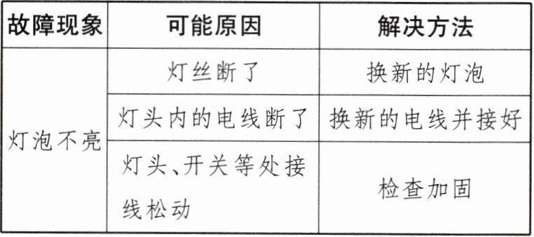 8. 同学们通过实践列出了白炽灯的常见故障与解决方法,其中一项的相关情况如表所示,这个故障在表中已列出的可能原因可以概括成一个,这个原因是(
